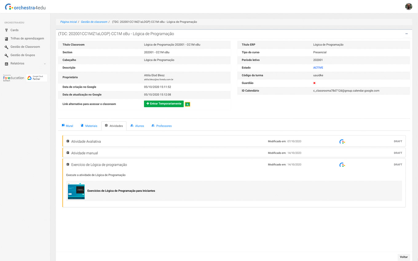 Verifique todo o processo de publicação de notas das atividades realizadas pelas turmas no Google Classroom, gerenciadas pela integração com a plataforma.