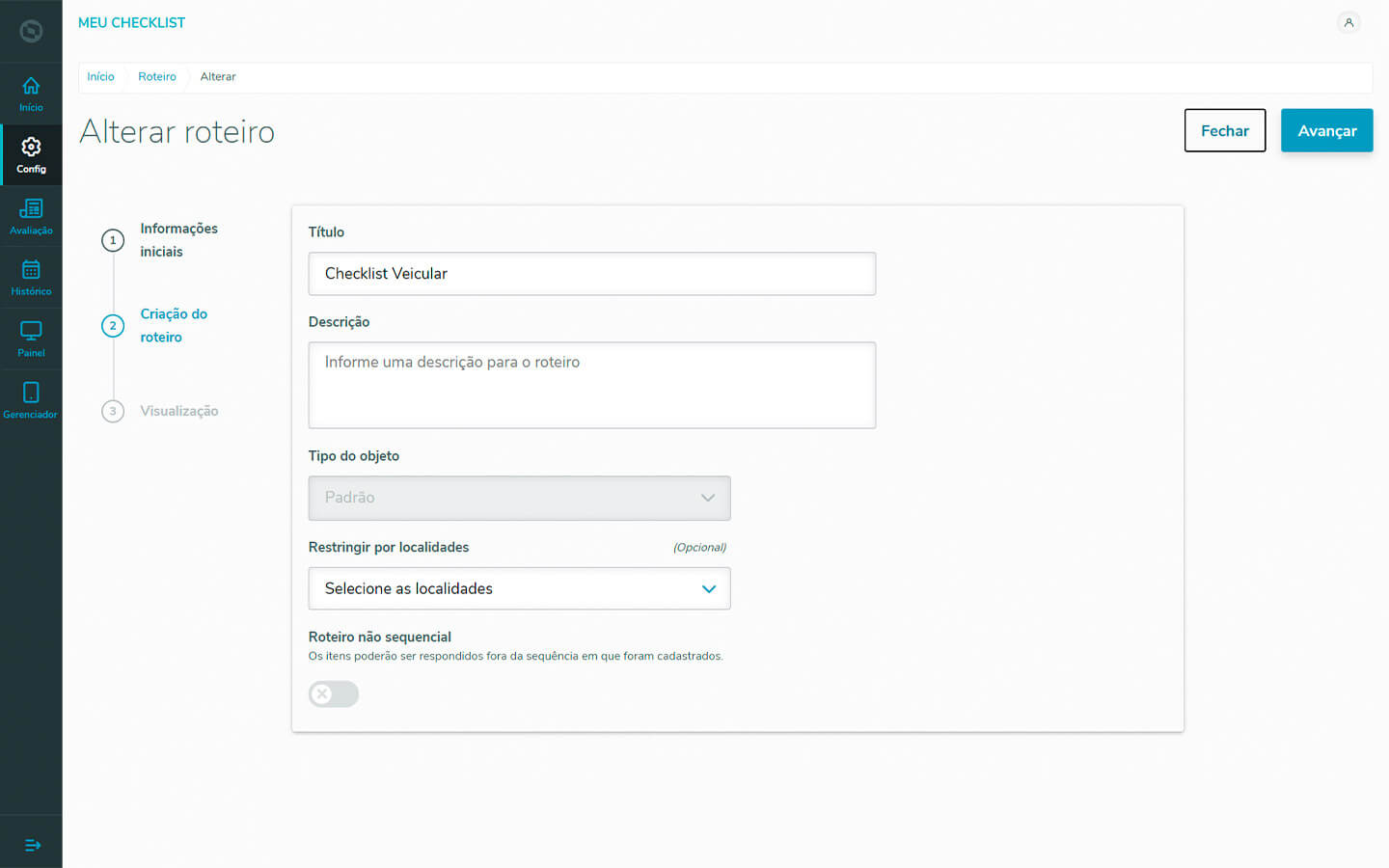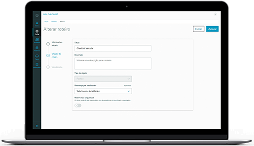 Crie seus roteiros de inspeção com os itens que precisam ser verificados em cada processo, de acordo com as necessidades da sua empresa.