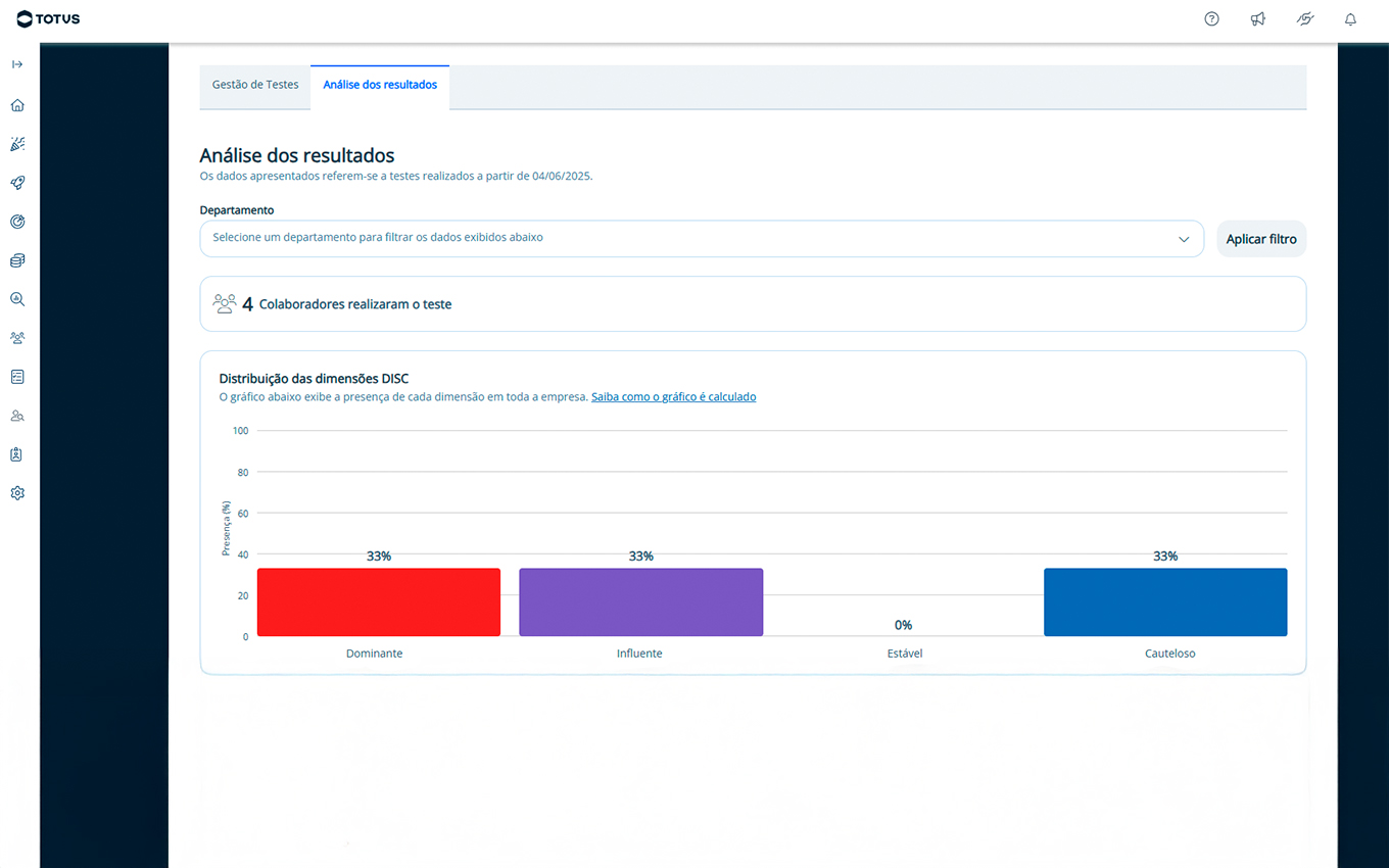 para contratações assertivas. Receba resultados baseados nas dimensões Disc: Dominância, Influência, Estabilidade e Cautela.