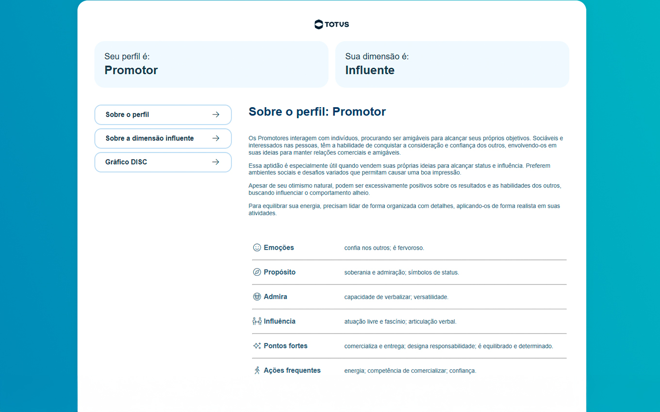 Integre com o TOTVS RH Atração de Talentos. Inclua a avaliação comportamental nos processos seletivos: o teste é enviado e o resultado DISC entra direto no currículo.
