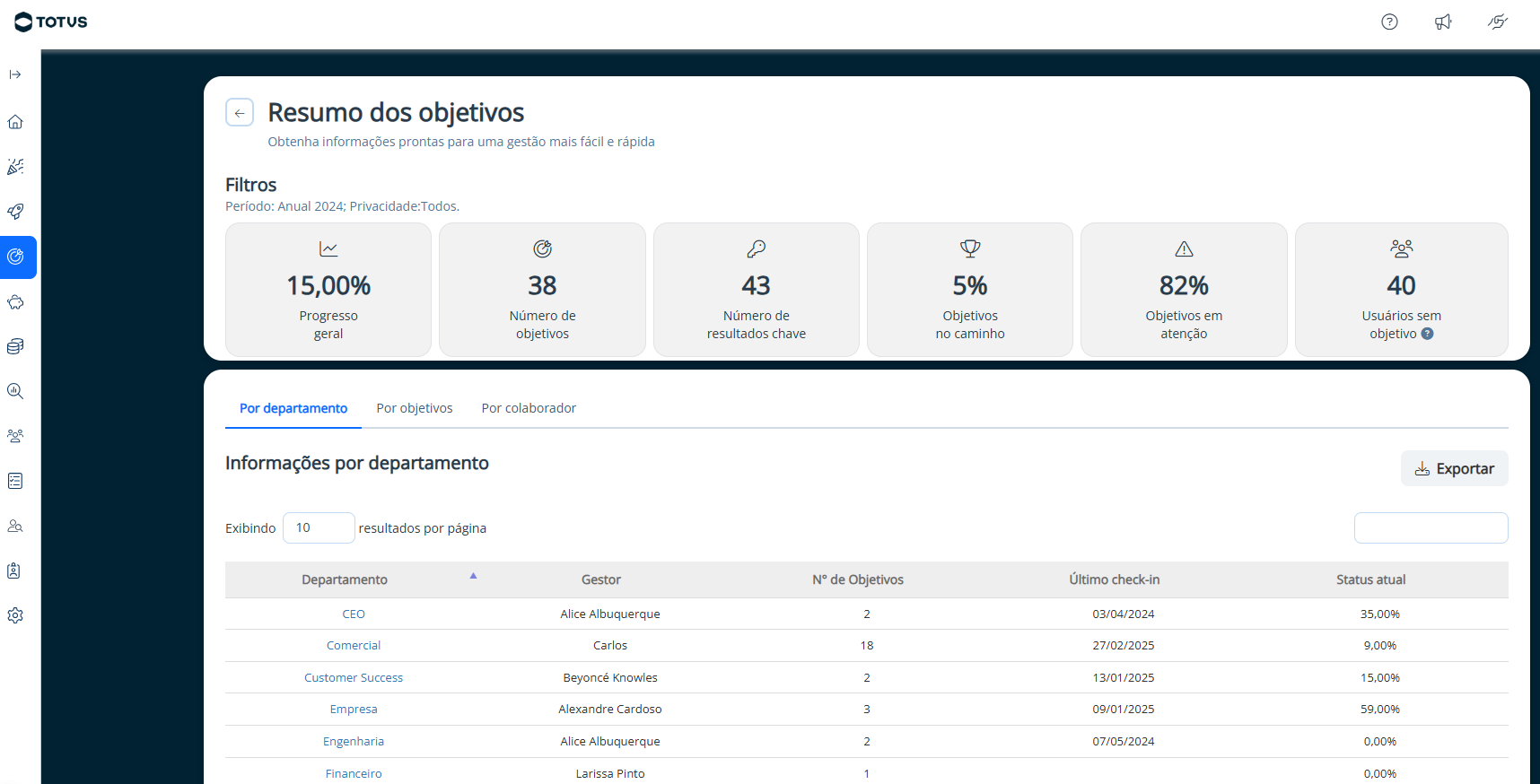 Gere relatórios de OKR com status, metas e planos de ação para decisões mais rápidas e uma gestão estratégica eficiente.