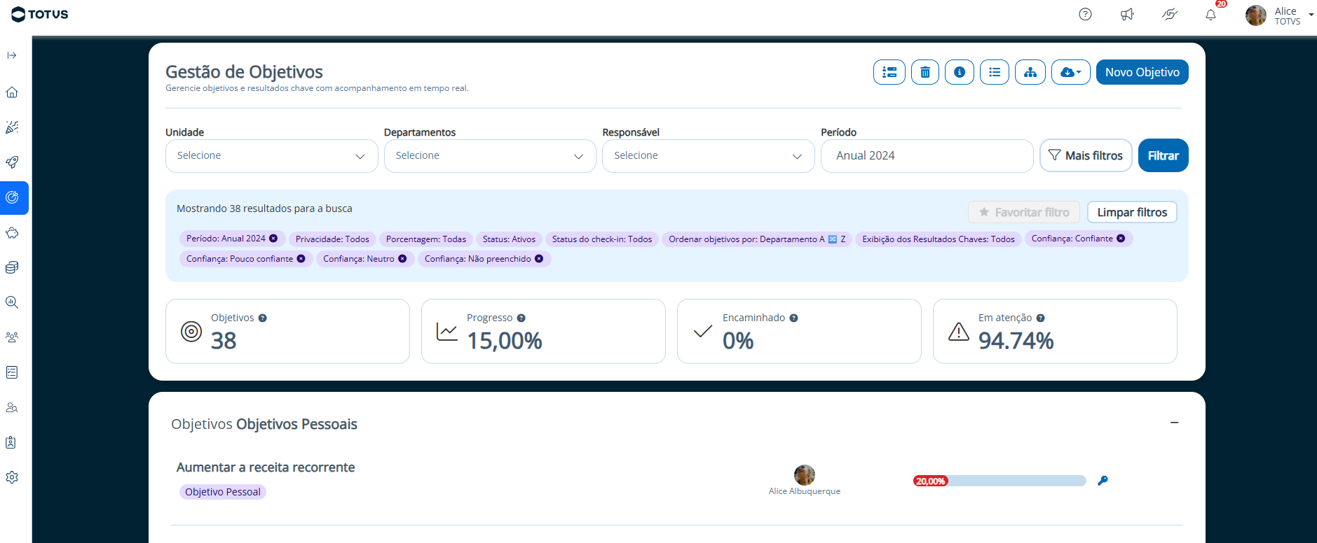 Crie objetivos e metas flexíveis com a plataforma de OKR: personalize hierarquias, indicadores, usuários e regras por área ou filial.