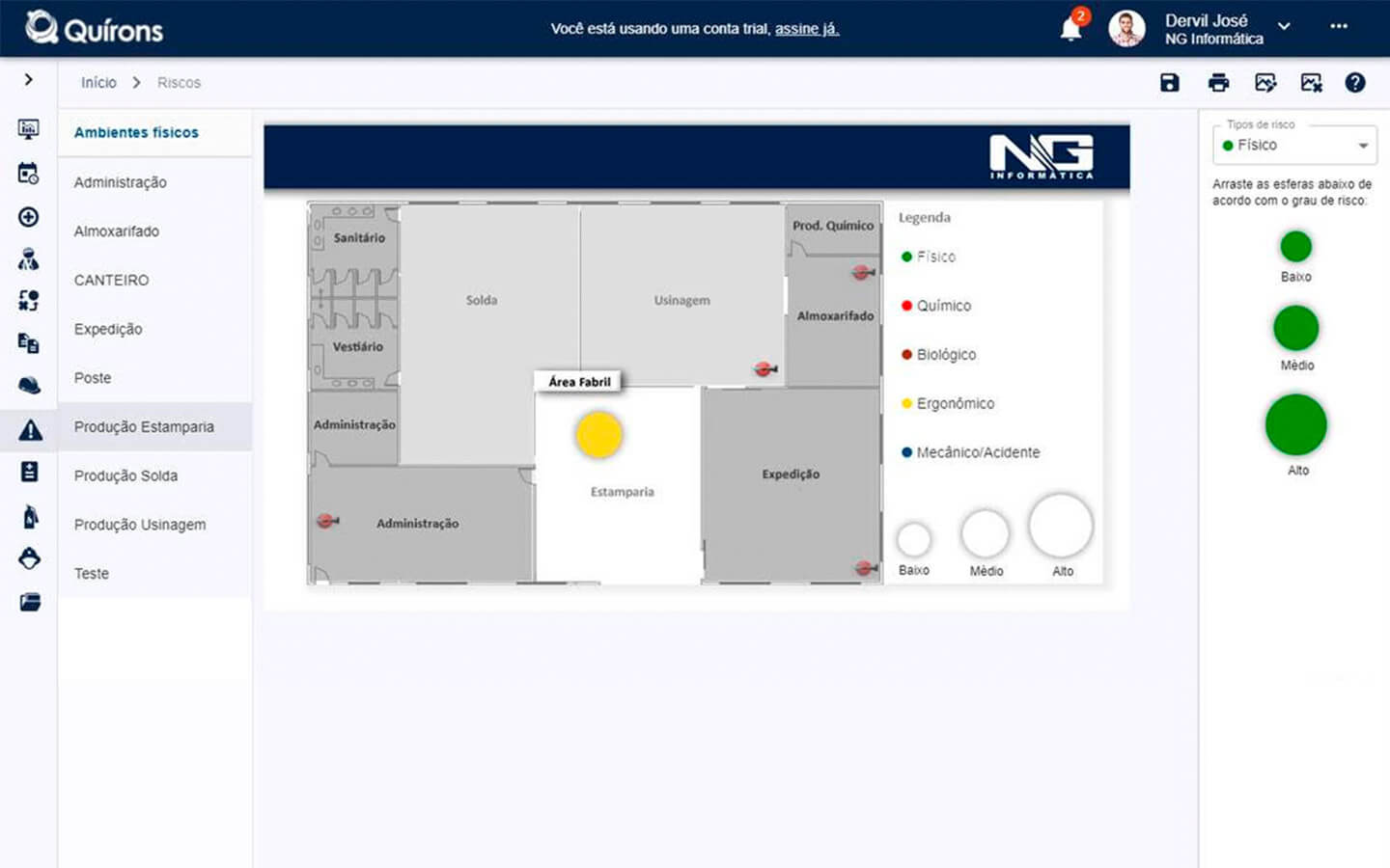 Avalie os riscos ambientais, de segurança, de saúde, ergonômicos, entre outros, que são registrados no sistema com dados sobre impacto, localização etc.