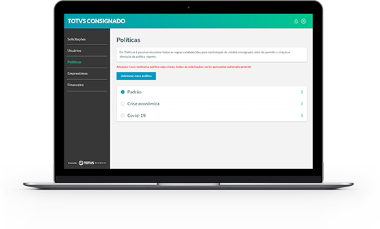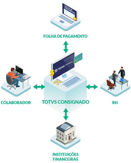 O produto automatiza o fluxo de informações necessárias para a gestão do empréstimo consignado, simplificando a comunicação entre a folha de pagamento da empresa e as instituições financeiras parceiras da TOTVS, de forma contínua e por meio de APIs. A solução ainda automatiza todas etapas do processo de crédito consignado dos colaboradores, desde a elaboração do contrato, aprovações e conciliação dos descontos na folha.
