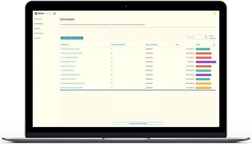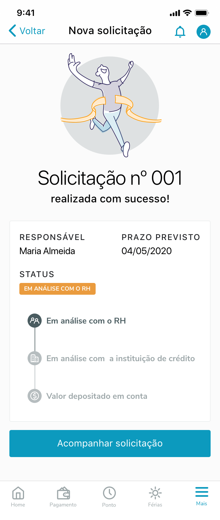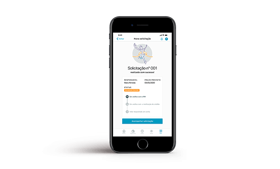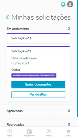 Apresenta ao colaborador a evolução das novas solicitações como aprovação, reprovação, envio de documentos e liberação.