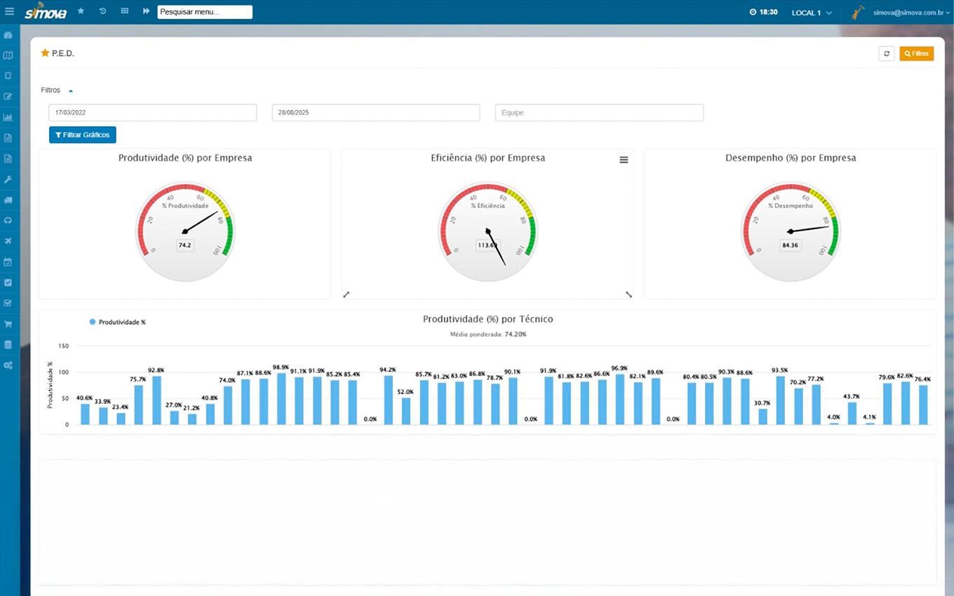 Centralize a gestão dos técnicos em um só lugar, com visualização do status de cada membro da equipe, agenda e ordens de serviço previstas para os próximos dias.