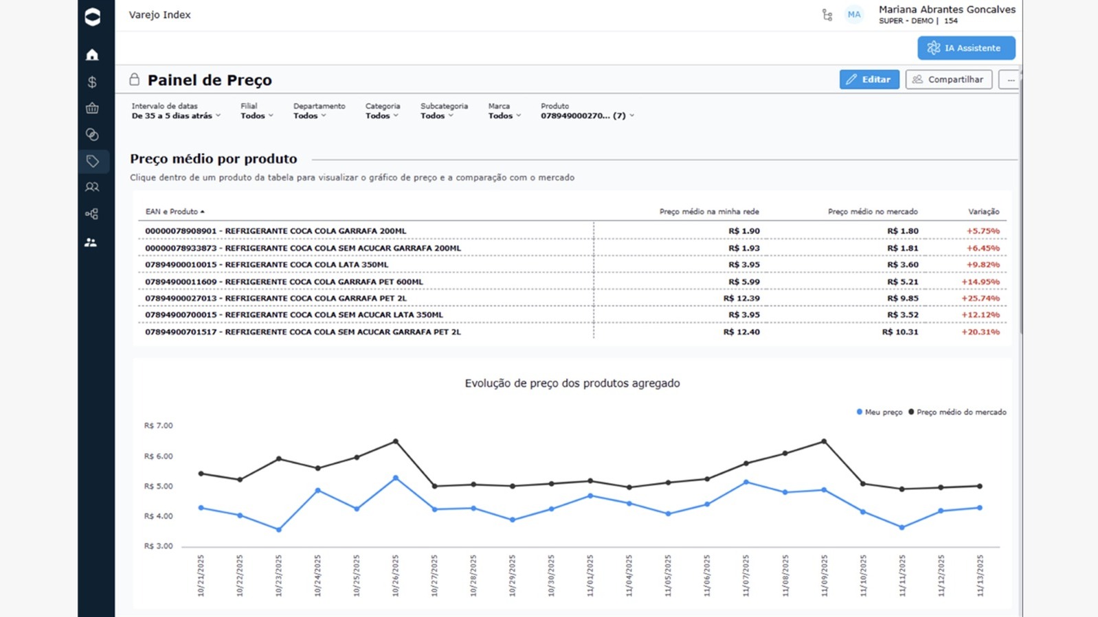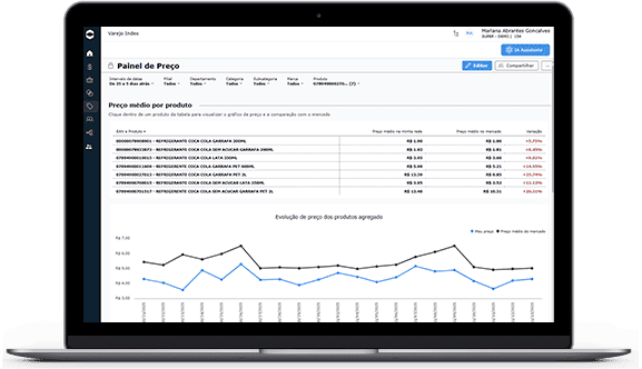 Monitore variáveis como Mix de Produtos, Preços e Análise Competitiva. Use filtros inteligentes para detalhar visões e extrair insights estratégicos para o seu negócio.