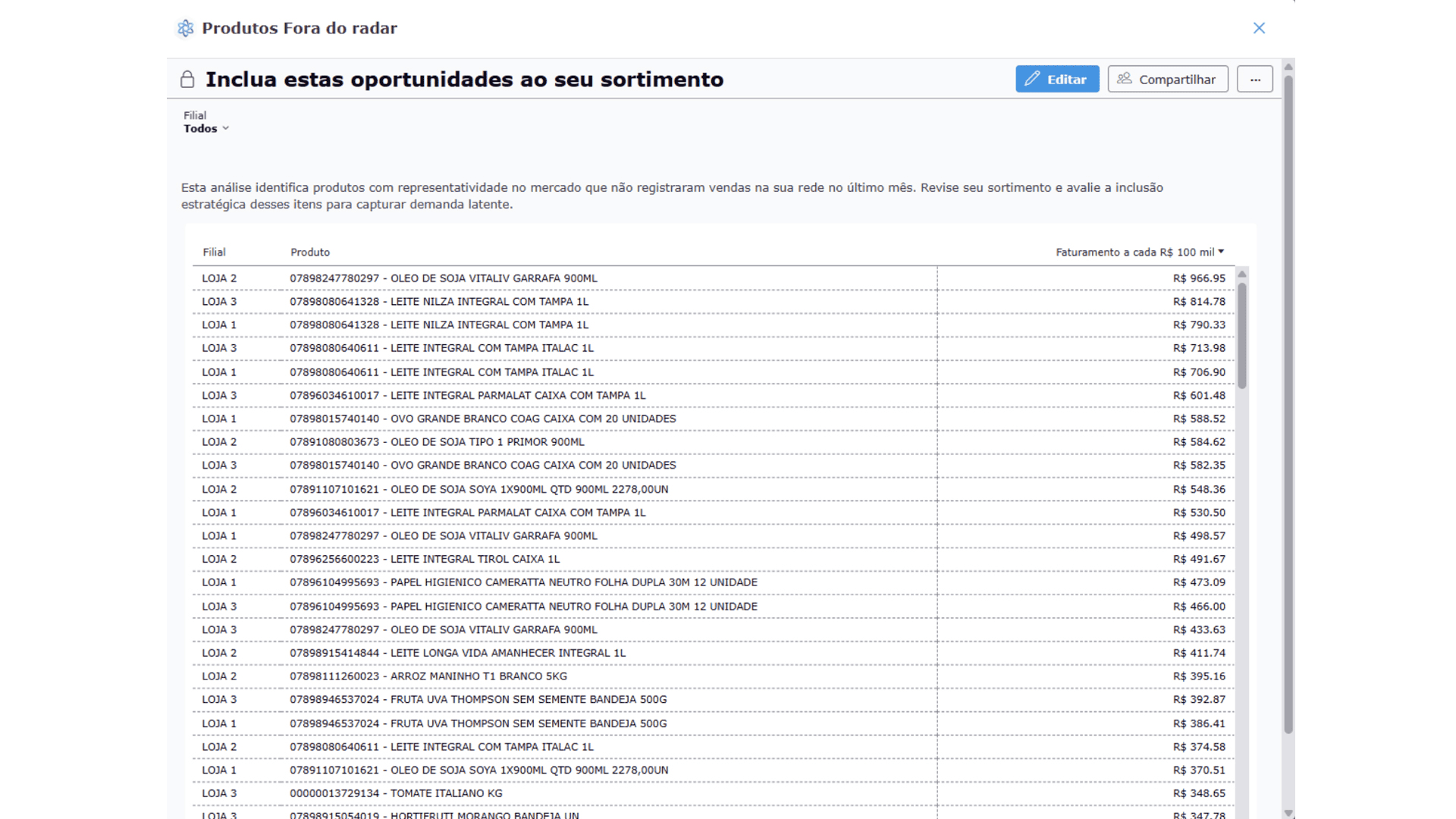Gere visões detalhadas e análises estratégicas para as necessidades do seu negócio, aplicando filtros avançados por Categoria, Produto, EAN e muito mais.