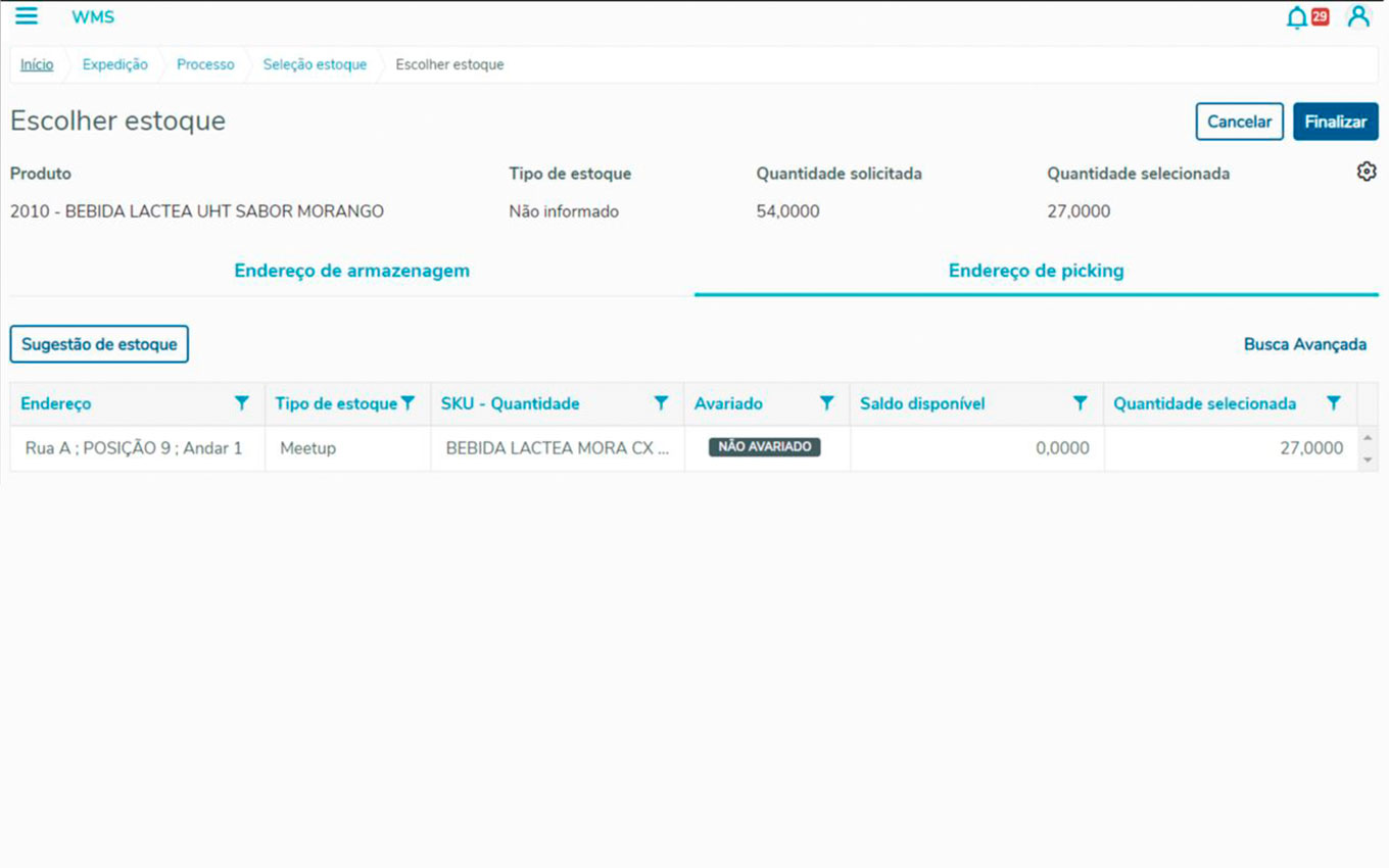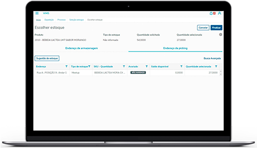 Automatize a seleção de estoque e faça movimentações mais estratégicas. A seleção também pode ser manual, funcionando no modo de sugestões do app Meu WMS.